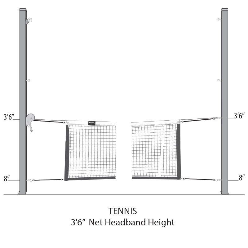 The adjustable Unicourt™ net is 34″ high and is available in (4) standard lengths. The length of the net should be 4′ shorter than the post spacing, leaving a 2′ gap on either side of the net. Contact us to order a custom size net to accommodate your court.